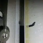| При открытии или закрытии пластиковой двери, край цепляет за железные замки, расположенные на раме. Для закрытия двери на ручку приходится прикладывать большое усилие. При этом ручка не достигает вертикального положения. | - Мастер регулирует петли дверной фурнитуры шестигранным ключом.