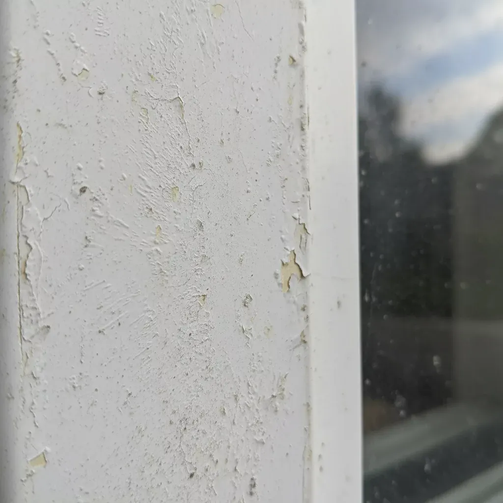 - УФ-деградация: солнечный свет разрушает полимерные цепочки в ПВХ. С годами это приводит к изменению отражения света от поверхности: белый цвет становится жёлтым или тусклым.